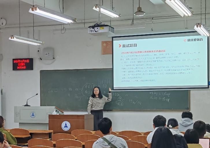 在讲座现场,王亚老师一开场便直击要点,为在座的学生们带来了一系列实用的备考干货,开门见山地分享了诸多高效备考技巧,尤其针对如何在有限的时间内掌握那些难度较高的知识点进行了深入讲解,为同学们指明了备考的方向。接着,王亚老师围绕 “公务员考试究竟考什么” 这一核心问题展开了详细讲解,并着重从笔试与面试两方面展开解答。