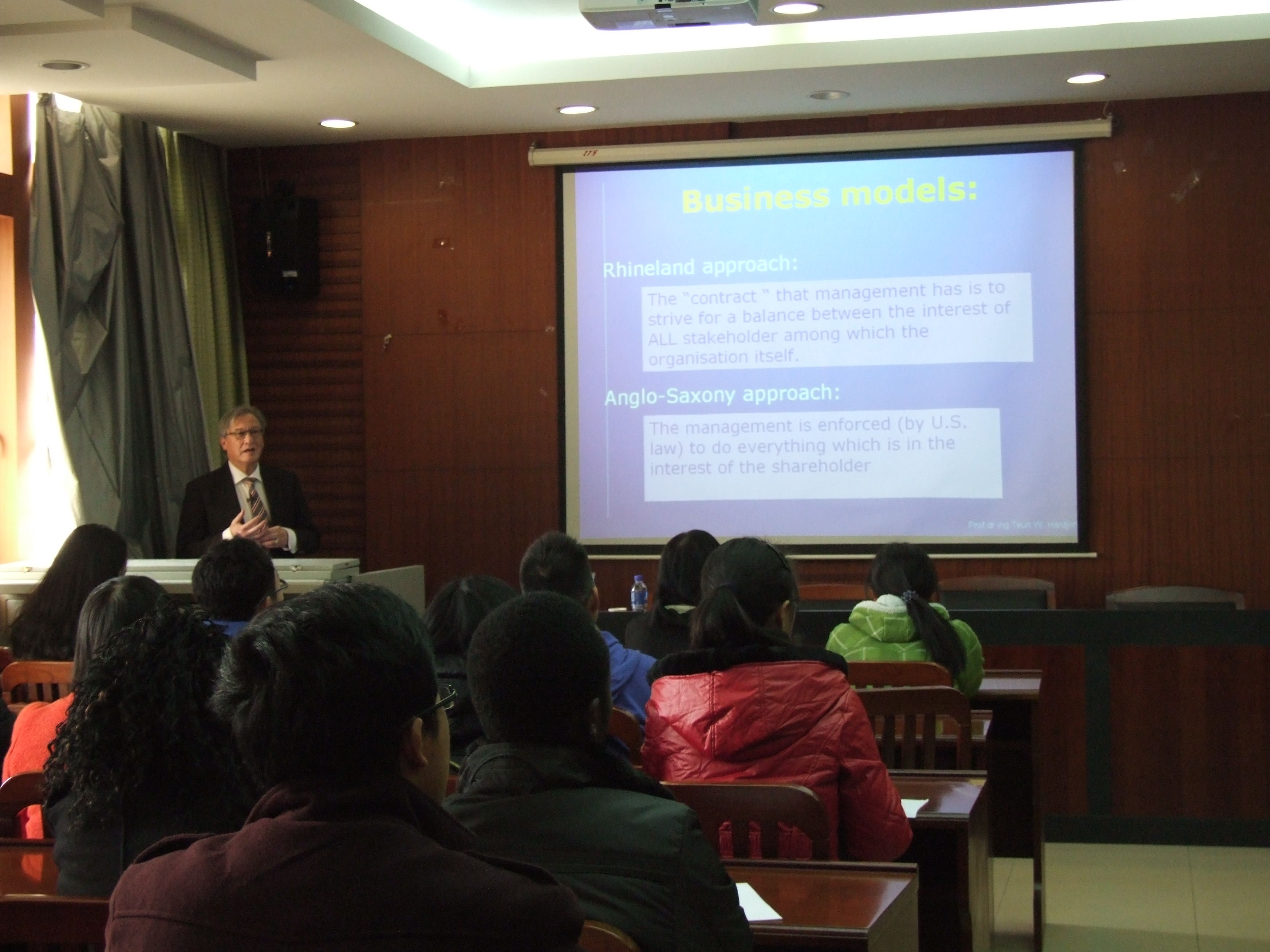 2012年12月6日下午,荷兰鹿特丹伊拉斯姆斯大学Teun Willem Hardjono教授来到永利集团3044官网欢迎您为同学们讲座,主题为欧洲对产品和服务质量管控的新方法。永利集团3044官网欢迎您副院长罗良文教授主持讲座,永利集团3044官网欢迎您教师、本科学生和部分我校留学生倾听了讲座。 Teun Willem Hardjono教授是荷兰鹿特丹伊拉斯姆斯大学(ERASMUS UNIVERSITY)教授,同时又是鹿特丹企业社会责任学院的联合创始人之一,荷兰GOUDA市市政委员。他的研究方向集中在欧洲企业社会责任划分。他将质量管理战略分为5个阶段,即产品质量阶段、加工工序质量阶段、系统质量阶段、商业链条质量阶段和社会质量阶段。这5个阶段的复杂程度是递增的,而可操作的工具选择也同样是递增的。 这一划分思路非常新颖,引起了同学们的极大兴趣。联系中国现实,同学们重新审视了中国产品质量管理问题,中国乳制品等食品安全问题又一次成为讨论的热点。同学们也试着运用所学的经济学知识与Teun Willem Hardjono教授的管理学理念进行融合辩争,他们提出问题,试图从交叉学科的角度解决提升企业社会责任与企业追求利润最大化之间的矛盾。部分我校留学生也对这一选题表示了浓厚的兴趣,他们从更为广阔的国际视角探讨他们本国的相关质量管理战略,通过比较分析,引发了进一步的积极思考。