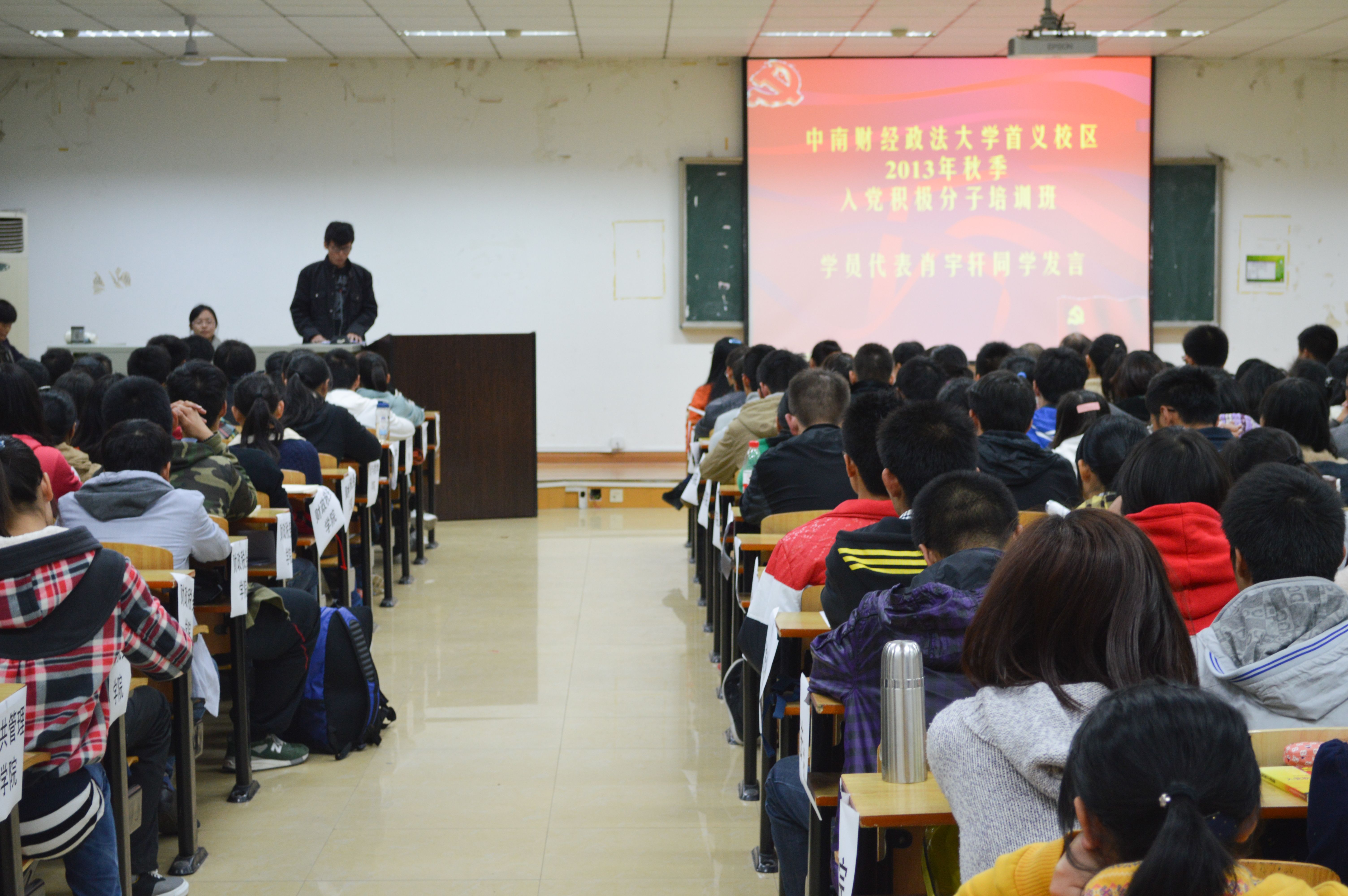 ——2013年秋季入党积极分子培训班开学典礼成功举行 (新闻与网络技术部覃显雅时瑞)11月14日下午6时,永利集团3044官网欢迎您2013年秋季入党积极分子培训班首义校区开学典礼在文润楼303教室召开。莅临本次开学典礼的领导有金融学院党委书记江克宁、学生工作部副部长兼首义校区学生工作办公室主任朱虹老师、永利集团3044官网欢迎您2013级辅导员蒋芳老师以及其他各学院的辅导员老师。本次入党积极分子培训班由永利集团3044官网欢迎您、金融学院、法学院、刑事司法学院、统数学院、财税学院、公共管理学院以及MBA学院共八个学院296名入党积极分子组成。 开学典礼在国际歌的奏响中拉开了帷幕。首先是由金融学院党委书记江克宁书记发言,他言辞恳切,给同学们提出了三点希望:第一是认真学习,同时树立一个正确的人生观、价值观,端正入党动机,积极争取入党;第二是深入思考,在学习过程中讲究学习效率,注重学习方法——将学习到的理论知识与生活相结合,与党的十八届三中全会相结合。同学之间应广泛交流,相互学习,共同提高;第三,在生活和学习中,用共产党员的规范来管理要求自己,身体力行。 来自金融学院的学生代表肖宇轩同学在接下来的发言中表达了自己坚定的共产主义信念,并提出认真学习先进的科学理论知识,积极关心国家时事的重要性。另一方面,他提出同学们要积极参加小组讨论,进一步锻炼自己的综合能力,将培训班中的所学所感带到生活当中去服务于社会。 最后,分党校老师汪梅芳老师宣读了分党校学院管理制度,她从平时上课制度与期末成绩评定进行讲解,希望同学们能以共产党员的规范来严格要求自己,严格遵守分党校学院管理制度,认真学习科学理论知识。 开学典礼之后,由金融学院党委书记江克宁书记给同学们上第一堂主题为“端正入党动机,争做合格党员”的党课。江书记指出,端正入党动机,目的是让我们认识到入党不是一时的形式上的光荣,而是意味着要在一生中切实承担起党员所肩负的责任和义务。入党不仅是从组织上入党,更重要的是从思想上入党。用党员的标准来规范自己,要加强党性修养。 本次开学典礼与入党教育的第一课在同学们热烈的掌声中落下帷幕。这次开学典礼让同学们更加深入地明白了入党的意义以及作为一个光荣的共产党员所肩负的责任,更号召同学们努力提升自己,积极争取早日加入到党的队伍中来。