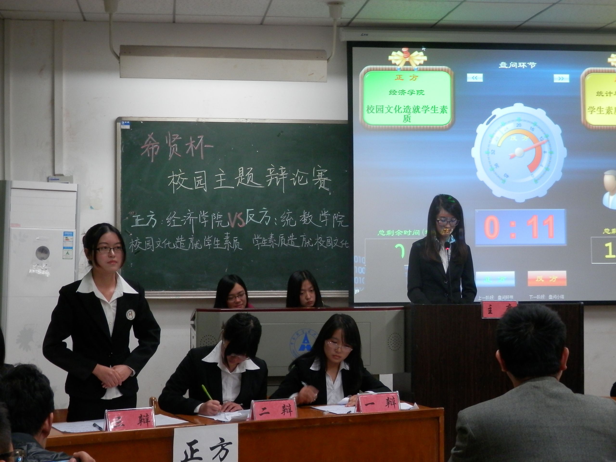 ——“希贤杯”校辩论赛初赛 (新闻与网络技术部周筱雯李思远)2013年11月27日晚7点整,“希贤杯”校辩论大赛初赛在文润楼正式拉开帷幕,此场比赛由永利集团3044官网欢迎您对战统计与数学学院。本次辩论赛辩题为“校园文化造就学生素质还是学生素质造就校园文化”。永利集团3044官网欢迎您为正方,持“校园文化造就学生素质”观点;统计数学学院为反方。马克思主义学院何西瑞博士,李世黎博士,2007年国际大专辩论赛冠军队队员徐小奔担任此次比赛评委。 在主席简要介绍过赛事规则和辩手们简短的自我介绍后,比赛第一环节“开篇立论”开始。双方一辩要在三分钟内完整陈述己方的基本立场和基础论据支撑。正方一辩自信从容,风度优雅,从“校园文化引导学生发展方向”,“校园文化对学生能力素养起直接塑造作用”以及“校园文化建设为社会发展提供了重要的人才支持”这三个方面将“校园文化造就学生素质”的理由娓娓道来。反方一辩同样也从三个方面论证了自己“学生素质造就校园文化”的观点,他们认为第一,学生的创新性和能动性造就了新兴的校园文化;第二,学生作为校园文化主体能通过自身素质使校园文化逐渐积淀;第三,认识到学生素养具备造就校园文化的能力将能促进两者共同发展。双方立论皆有理有据,逻辑严密,为整场辩论赛奠定了基调。 接下来为驳论环节。所谓驳论,即通过揭露和驳斥对方错误的论点来确立自己的论点,由双方二辩来完成。两位辩手都紧抓对方在立论环节时的漏洞,针锋相对。可以看出双方在“学校教育理念的引导与学生个体的主观能动性在建设校园文化时的关系”及“丰富与发展是否就是造就”等问题上存在较大分歧。第三环节为盘问环节,即对对方进行挑战性的询问。问方40秒时间,答方80秒时间,正反双方各有两次盘问机会。在这次正面交锋中双方辩手都毫不示弱,试图将对方逼进逻辑的“死胡同”。面对反方一个个尖锐的问题,永利官网辩手沉着冷静,用敏捷的思维巧妙应对。四轮盘问结束后进入全场最激烈的自由辩环节。永利官网辩手通过列举同为常青藤学校,但哈佛大学学生擅长演讲的语言艺术,麻省理工学生却擅长缜密的逻辑推理的例子来论证不同的校园文化造就了学生不同的素质,而反方以社团文化为例坚持认为学生素质造就了校园文化;正方否认反方片面将社团文化看作校园文化的逻辑,反方同样否认正方的论据,认为是本身具有某种素质的学生汇聚在一起才形成了某种校园文化氛围。双方紧扣对方的矛盾节点,向对方展开强大攻势。自由辩环节结束,由双方四辩在四分钟内总结己方陈辞,梳理本场辩论的思路,进行最后的论述。 辩论赛结束后,三位评委对场上的辩手进行了提问,并对一些问题发表了一些自己的看法。最后由评委进行投票,决定本场的胜出者。永利官网以1:2的投票结果惜败统计数学学院。永利官网四辩杨玥涵获得全场最佳辩手称号。 永利官网止步“希贤杯”初赛的结果令人惋惜,但是永利官网辩手优雅的气质,敏捷的思维,强大的语言组织能力,给在场评委留下深刻印象,赢得其高度评价。一次比赛收获一次经验,永利官网辩论队的明天必定更加美好!让我们一起期待永利集团3044官网欢迎您在下届“希贤杯”比赛中打个漂亮的翻身仗!