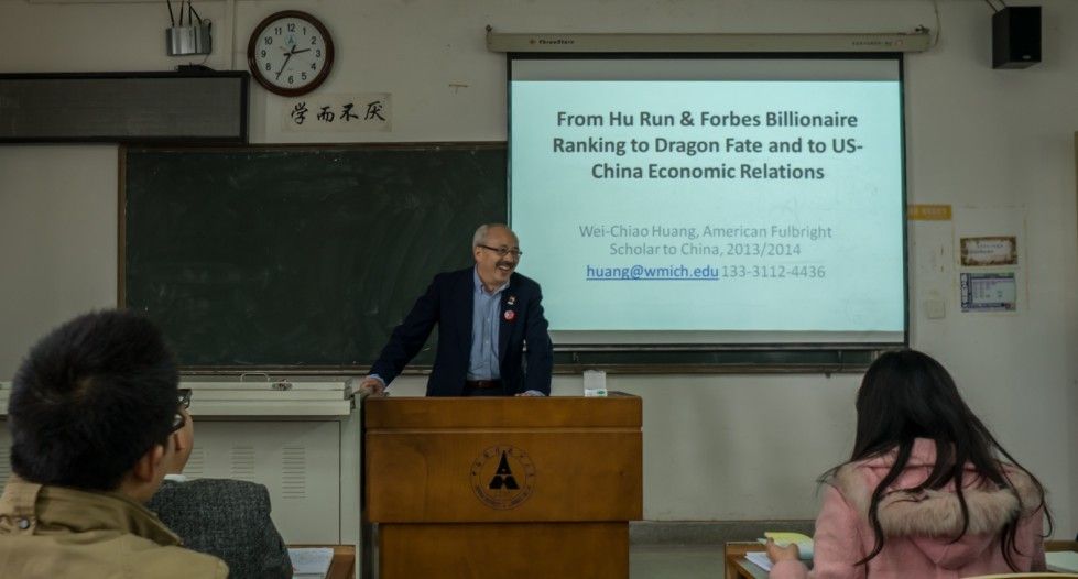 讲座开始前,金应华老师首先简要介绍了黄维乔教授的学术成就和学术地位,接着用幽默的例子引入所讲的主题,在场的同学热情高涨,掌声连连。随后,黄教授开始讲授。黄教授首先简述了自己在各国游学的经历,以及工作的经历,着重讲述了自己如何结合实际选择自己所感兴趣的研究领域。然后黄教授自然进入本次讲座的主题——“From Hu Run & Forbes Billionaire Ranking to Dragon Fate and to US-China Economic Relations”。黄教授根据“胡润百富榜”所公布的数据和有趣的发现提出了自己的思考:属相是龙的人群是否在财富榜上拥有更好的运气。然后针对此问题,讲述了自己的实证研究的结论。在对此问题进行启发性的讲述后,黄教授针对中美关系的问题阐述了自己的独特的见解,尤其是针对中国与美国之间的利益对抗进行了深入分析,得出“中国与美国是相互依存的关系,需要相互促进”的结论。