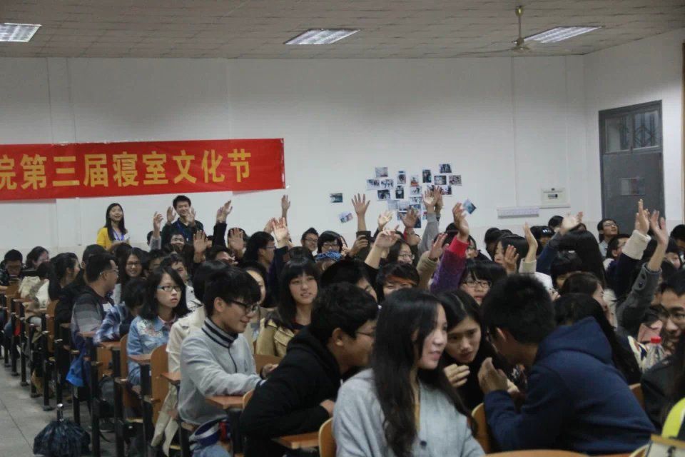 第二项是本往届寝室文化节的视频展示,也把这次开幕式的气氛推向了高潮,视频展示了温馨的寝室布置,深厚的同学情谊。通过视频展现出来的日常趣事让大家捧腹的同时也让大家更加珍惜身边的这些朝夕相处的室友们。 在大家还沉浸在精彩的视频之中,感受着寝室文化的一丝温情时,女生部部长高悦同学在第三项经验分享中分享了她们在准备寝室文化节时寝室同学的友谊是怎样一步一步加深的经历,陈宇辉也分享了他和他室友们一起不为人知的事情,许多同学听后也陆续加入了寝室趣事的分享环节中来。 第四项是游戏环节,本次游戏的主要形式是传话,由第一个同学记住一段比较长的话依次传递下去,直到最后一个同学写出来的话与第一个同学最为接近的小组即获胜,大部分同学都积极参与到了游戏中来,现场的气氛十分愉悦。 开幕式的最后一项也是最让大家期待的表演环节,陈冰珏同学演唱的《moves like jagger》获得了大家的喝彩,而舒缓深情的二胡独奏《如果有你》更是让大家沉浸其中。 最后,开幕式在《我们是一家人》的歌曲中落幕,让我们一起期待同学们在寝室文化节中的优秀表现,同时也预祝第三届寝室文化节圆满成功!