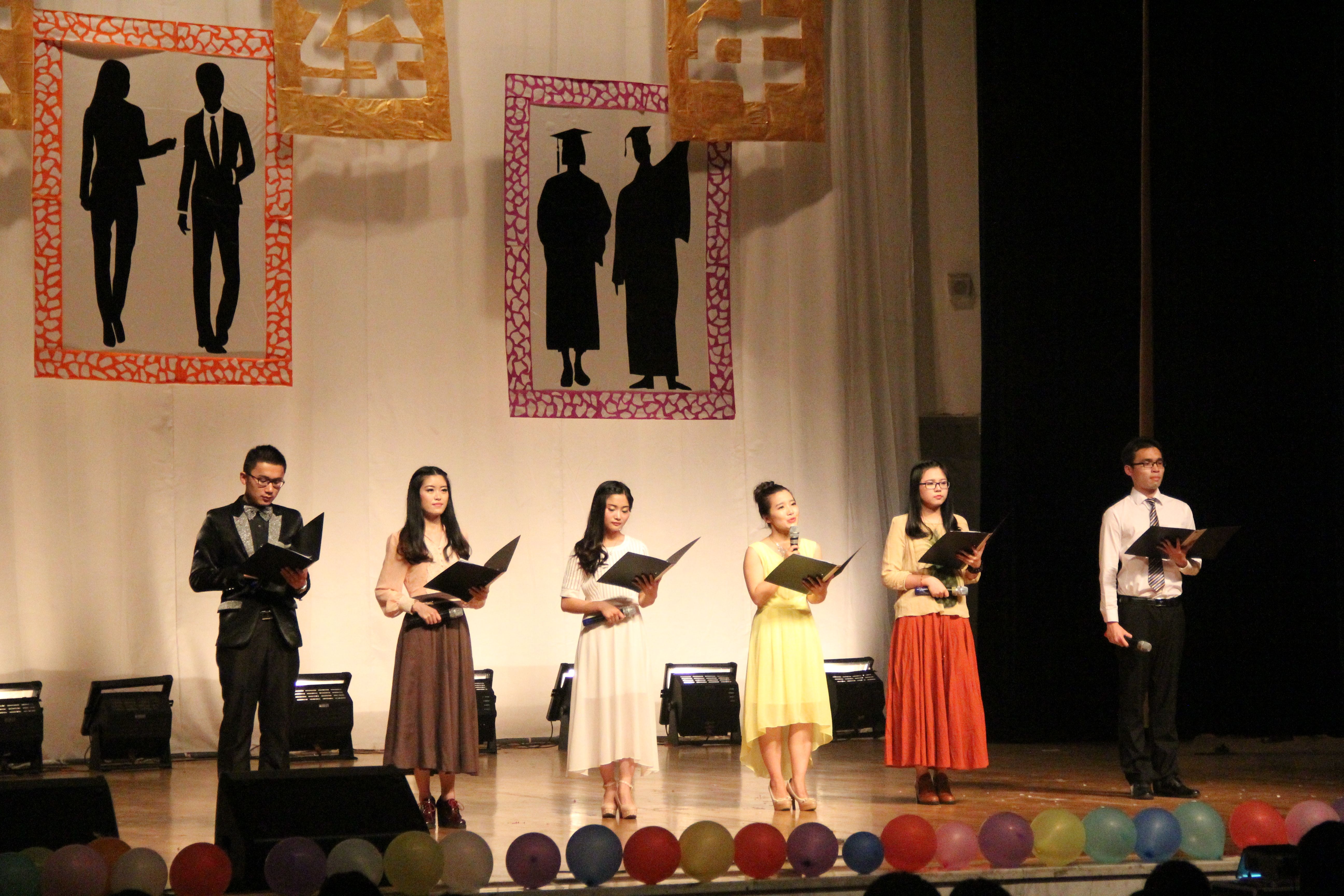 场内场外呼应,情谊相连 多元形式融合,内涵丰富 开场舞《Mamma Mia》以火热劲爆的舞蹈将整个晚会气氛带入高涨环节,紧扣观众的心弦。而在《克罗地亚狂想曲》的演奏中,肩上的小提琴、指尖下的黑白钢琴键、一张一合的手风琴将我们带入一个由乐符编织的空灵的音乐殿堂,曼妙的旋律余音袅袅、不绝于耳。小品《勿忘初心》以两个同学日常生活和和各种回忆为主要内容,以反讽的形式向大家诠释只要勿忘初心,坚持自己的梦想,就能够有所成就的道理。歌曲串烧《当你途径我的青春》和吉他弹唱《后来》从不同的侧面诠释了青春中的安逸与波澜,走秀《turn you on》则展现了年轻人应有的活力。 紧扣毕业主题,撩人心弦 街舞《卷珠帘》与合唱《we are young》充分彰显了毕业生身上所迸发出来的“恰同学少年,风华正茂;书生意气,挥斥方遒”的蓬勃朝气;A Cappella歌曲《心动》的表演者以优美的歌喉为我们讲述了一个大学期间的美丽爱情故事;中场视频以“大学中最遗憾的事”为主题为我们展示了即将毕业的同学的心愿和对自己学弟学妹们的祝福;朗诵《毕业了,我想对你说》诗一般的语言,梦一样的意境使得许多场下同学垂泪。一切的一切都带给我们太多太多的感动,微笑中我们不觉留下了感动的眼泪,欢呼中我们不觉感到丝丝的不舍与眷念;回忆的点点滴滴都历历在目,是那么的近又那么的远,似乎就在昨天,似乎又伸出双手无法触及。