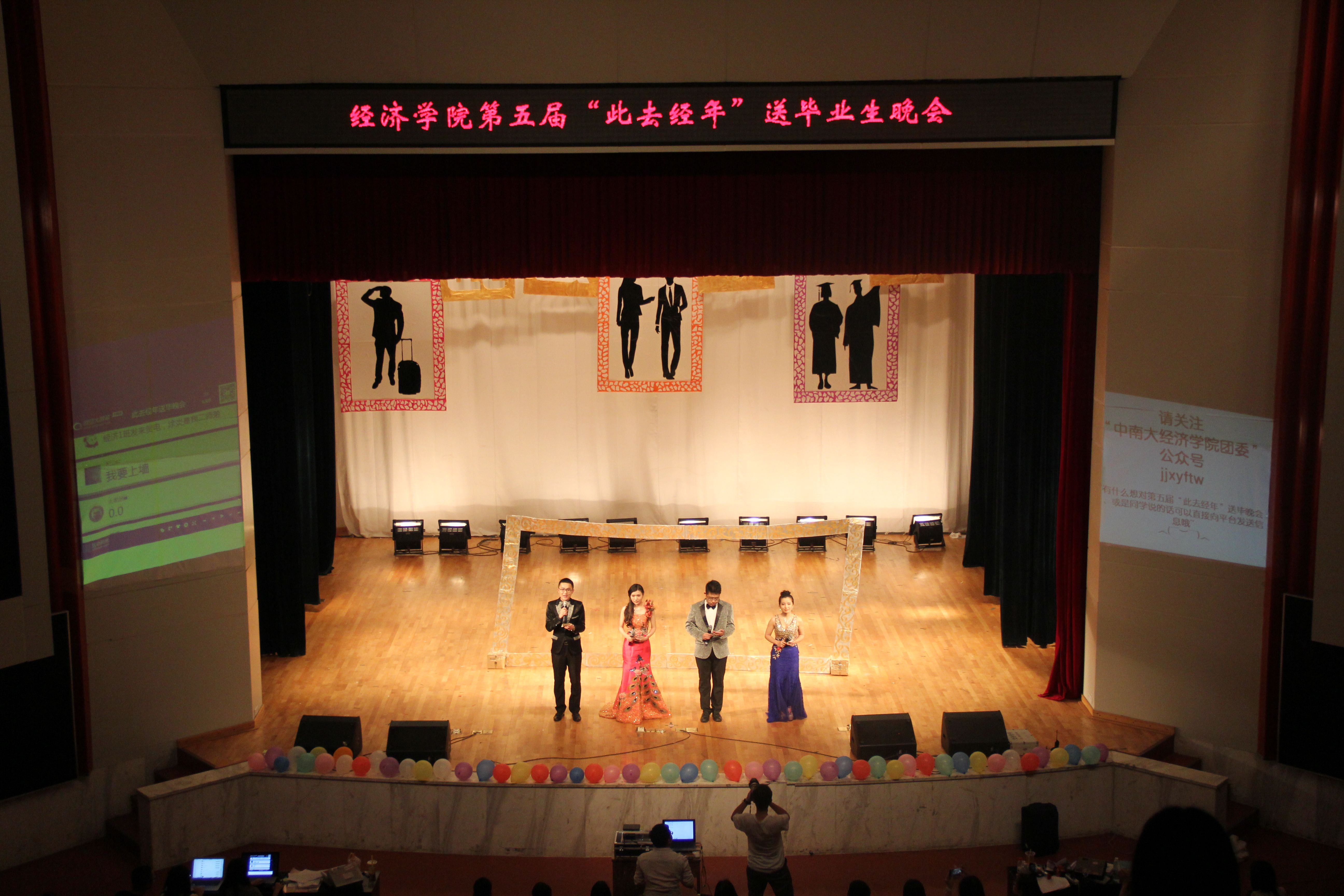 晚上9时30分许,第五届“此去经年”大型文艺晚会圆满落幕。本届“此去经年”大型文艺晚会在传统的晚会基础上引入了多元的元素,不仅在形式上得到了极大的丰富,内容上也有极大的提升。它不仅是大四同学对以往的点滴的回忆,也是他们毕业前收到的最精致的礼物和之美好的祝愿,也激励着一届又一届的经济学子勇往直前,不断的追求自己的目标!