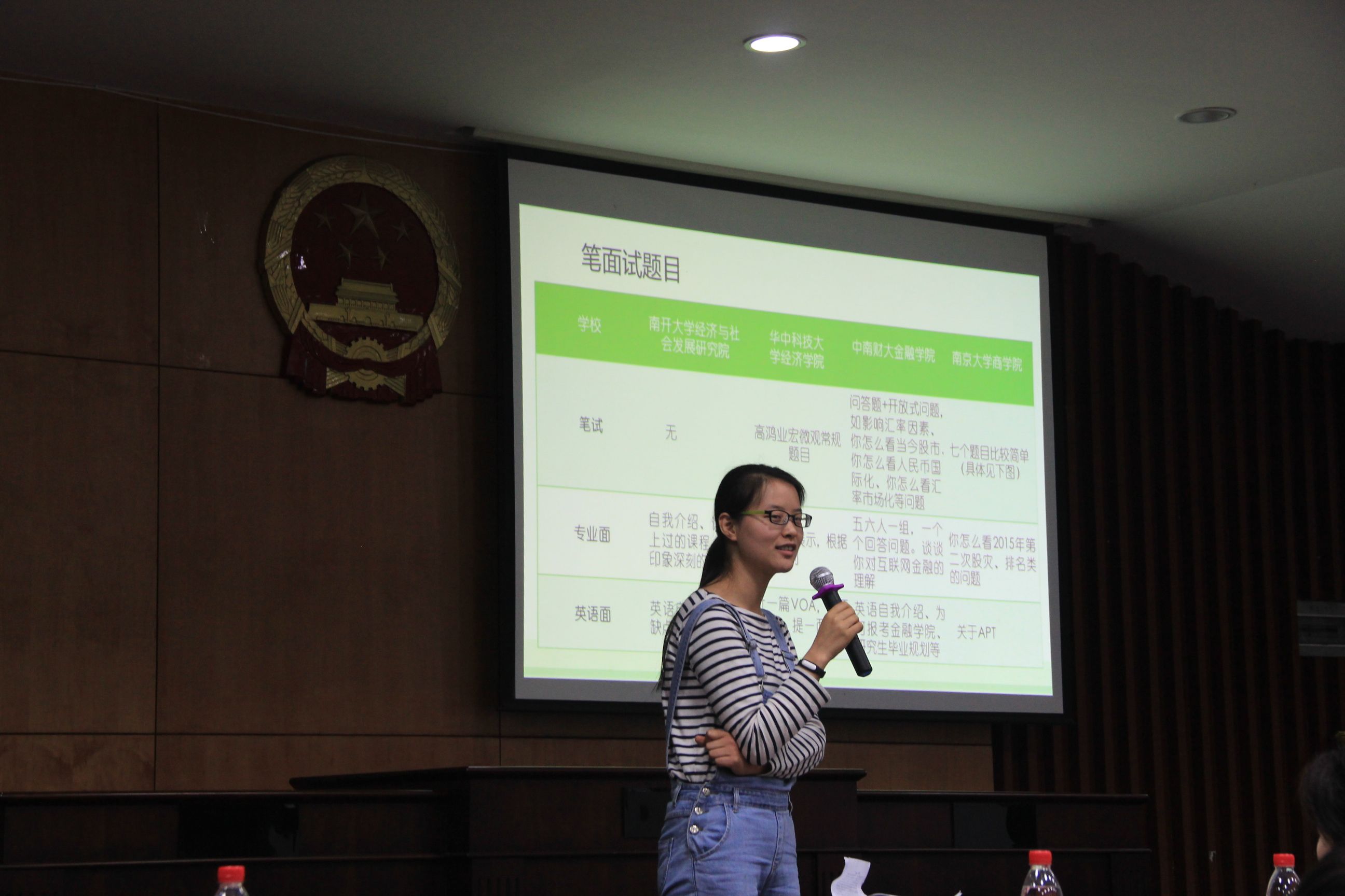 (新闻与网络技术部 任明喆 谢雨诗)2016年4月16日晚7点,由永利集团3044官网欢迎您分团委学生会创业实践部主办的保研交流会于南湖文泰楼模拟法庭2成功召开。本次交流会的主讲人是各学院成功保研的学生代表,他们组建了保研微咨询团队,通过分享自己的保研历程与经验,给在座的同学介绍了保研的相关知识并给出了自己的建议。 交流的内容大致分为保研的优势,前期申请材料的准备,参加夏令营的过程以及给同学们的建议和鼓励四个方面。王铁肩认为,保研的好处主要体现在两方面,一是相对于考研来说,保研的压力要小很多;二是在当今激烈的社会竞争下,拥有研究生学历会让同学们在就业时更具优势。 随后王颖又对前期申请材料的准备进行了介绍。同学们在提交材料之前,一定要仔细阅读想要报考院校的官方信息,并把每份官方信息中的主要内容,如时间、所要递交的材料内容、是否需要递交论文、夏令营安排等汇总成一张表格,方便之后查阅。除此以外,成员们还针对细节方面给出了很多建议,这些看似微不足道的地方其实才最容易让人眼前一亮。
