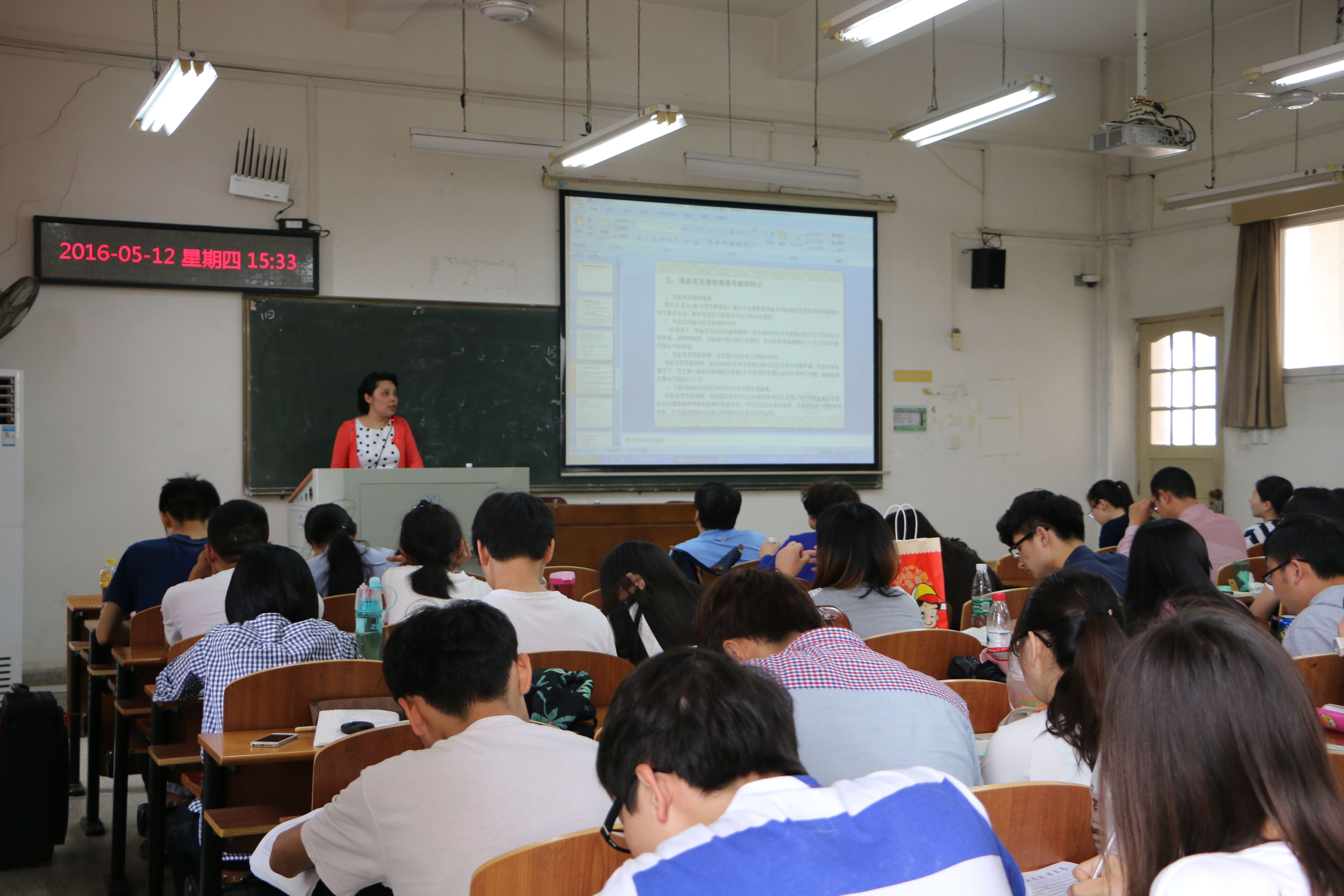 在谈到发展党员工作注意事项时,李明老师首先介绍了发展党员 中的几个基本原则:坚持党员条件的原则、保持党员质量的原则、坚持入党自愿的原则、坚持个别吸收的原则和“双过半”原则。接下来老师指出了发展党员工作中的几个“制度”:谈话制度、共青团组织(研究生导师)推优制度、发展党员培训制度、发展党员预审制度、发展党员(预备党员转正)审批制度、发展党员备案制度、发展情况(转正情况)公式制度和发展党员责任追究制度。此外,李明老师还介绍了“九个不发展”,党员材料的规范,审查入党材料需要注意几个时间节点的逻辑性及其他相关问题。