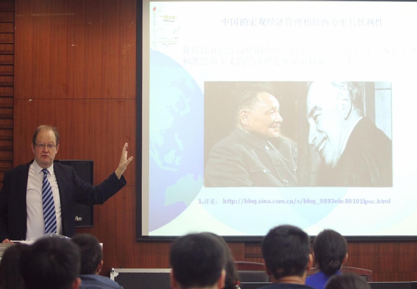 讲座开始前,罗良文教授向参加本次讲座的观众隆重地介绍了罗思义先生,并对他此次的到来表示了热烈的欢迎与感谢。 讲座伊始,罗思义研究员以美国新保守派阻止中国实现繁荣的原因和方法为切入点,深入探究经济增长的内在逻辑,以此探析美国新保守派方法的适用性。首先,罗思义研究员结合自己多年的研究与丰富的工作经验向大家深入剖析了美国新保守派阻止中国实现繁荣的原因和方法,他指出,中国经济高速发展,综合实力日益增强与国际地位不断提高,动摇了美国世界霸主的地位,导致美国通过诱导中国经济自杀的方式破坏中国经济。随后,罗思义研究员通过对马克思主义经济学和西方经济学的对比比较,从“邓小平理论中的斯密理论”、“经济增长核算领域的进步”、“中国确保投资的经济结构”三个方面,结合了图表展示,为大家深度解析了经济增长的内在逻辑与准确核算。最后,罗思义研究员围绕“中美经济发展历史趋势”“消费拉动增长策略的优劣性”以及“中国经济的瓶颈”三个主题,探析未来经济繁荣引领者,为中国经济发展提出“中国供给侧政策发力点”和“中国人要自信”两点建议。