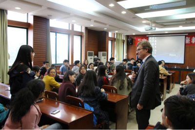Olivier Aptel先生对杨校长的接待表示感谢,并全面介绍了雷恩高商的有关情况,他希望能与永利官网在联合培养、组织学术科研活动、交换教师等方面进行进一步长期、有效的合作。Olivier Aptel先生生动和内容丰富的讲解赢得了在场师生的热烈掌声,交流结束后他还与师生进行了友好的互动与交流。最后大家一起在文泉楼下进行了合影。同学们都表示,经过此次与Olivier Aptel先生的交流见面,大家对赴法读研的生活有了更大的憧憬,也愈发觉得动力十足。