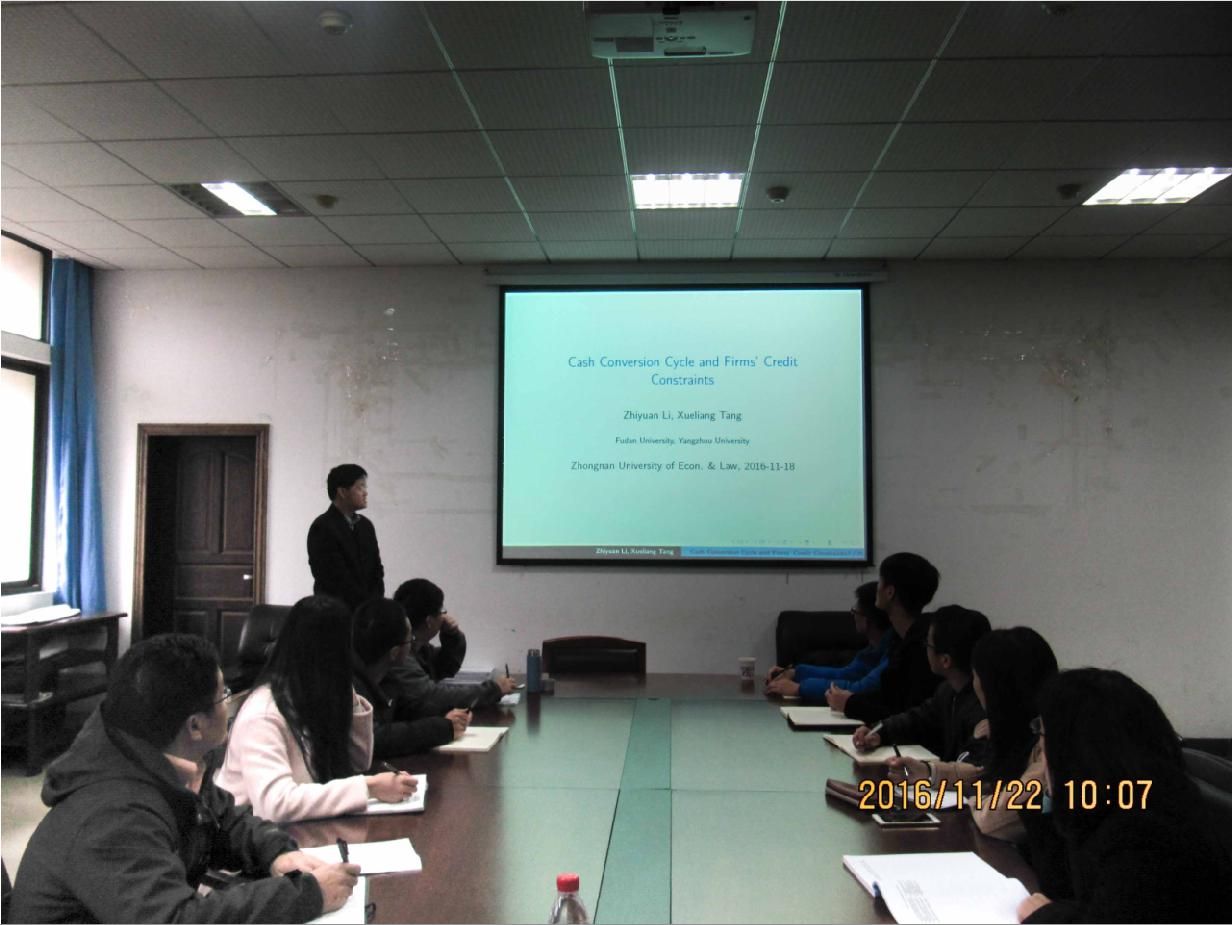 2016年11月22日上午10:00,美国加州大学戴维斯分校经济学博士、复旦大学永利集团3044官网欢迎您副教授李志远老师来到永利官网,为师生们做了一场题为《Cash Conversion Cycle and Credit Constraints》的精彩主题讲座。我校部分教师与研究生们参加了这次讲座。