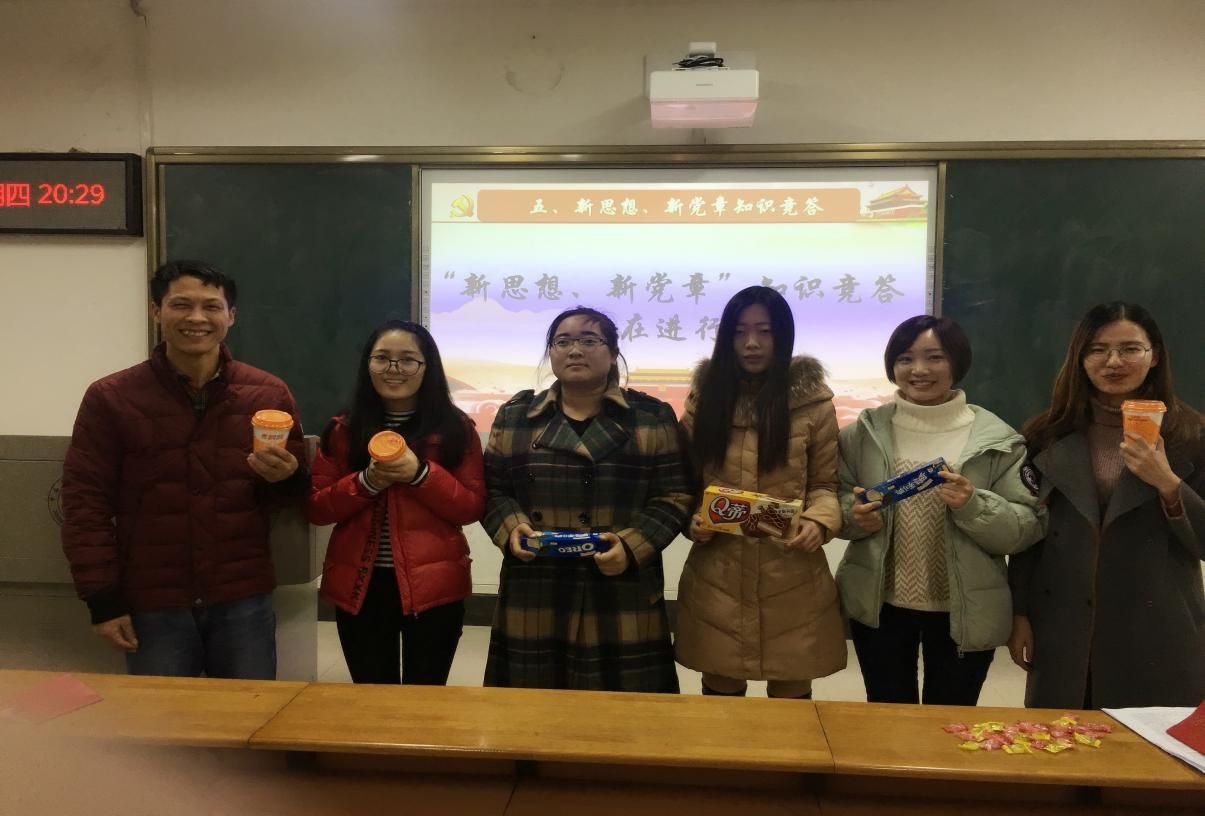 活动第五部分是“新思想”、“新党章”有奖知识竞答。竞答主要包含了新党章、十九大以及党史知识等方面的内容;比赛规则是由党支部组织委员李崇焕读题,宣布“开始”之后进行抢答,第一个回答且回答正确并完整的同学为胜,最终评出前6名获奖同学并颁奖。比赛现场如火如荼,党员们认真思考,积极抢答,表现出对党章以及十九大精神的熟练掌握。最终由白金同学获得一等奖,李娟娟和闫境华同学获得二等奖,余倩倩、刘培和陈思远同学获得三等奖。最后由支部书记刘怡君给大家颁发奖品,并且鼓励大家积极学习党章党史,学习十九大的新精神,加强自己的党性修养。