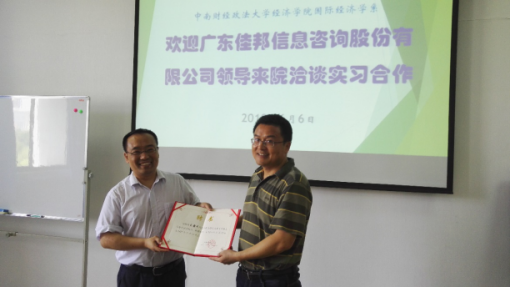6月6日下午2点,杰出校友广东佳邦信息咨询股份有限公司高级顾问元露丰,以及公司华中区销售总监神勇来永利官网洽谈大学生实习和产学研合作事宜。李小平副院长、国际经济学系主任陈浩老师,实习指导老师杨艳红老师、高红贵老师、刘绮霞老师参加了会谈。此前,在2017年广东佳邦信息咨询股份有限公司已与永利官网签署共建大学生实习实训基地协议并且挂牌。此次专程前来商谈今年实习的具体安排和进一步合作。