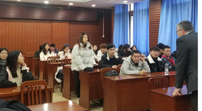 Thomas院长热情地邀请同学们对他提问,有三位同学主动起立提问,问题涉及在法留学的学习、生活和就业等方面。Thomas先生耐心地作答,并在同学们问题的基础上,分享他的一些经验。虽然法式英语增加了同学们理解的难度,但Thomas先生的分享依旧为同学们带来了拨云睹日的感受。