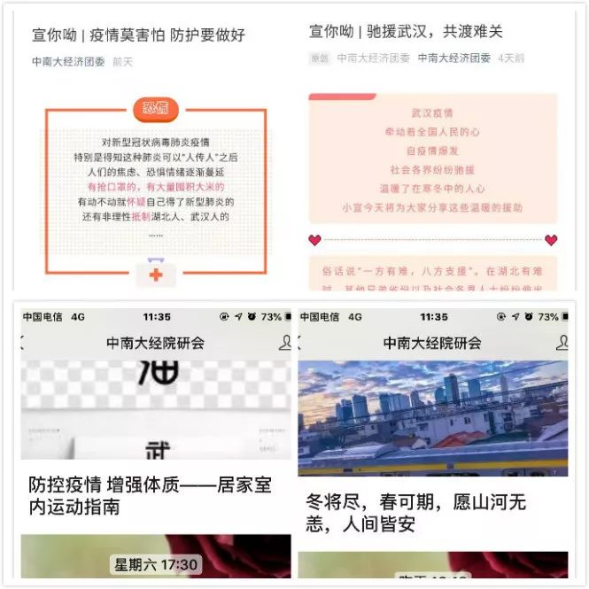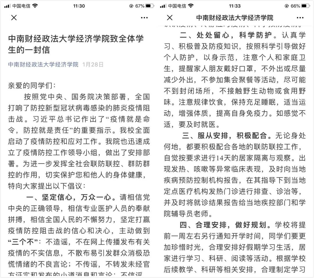 加强学生宣传教育工作,通过微信、微博等新媒体手段及时发布疫情防治知识和防控要求。要求研究生、本科生辅导员核实寒假留校确切人数及名单,线上传达转发相关防控通知,提醒学生做好防御,协助学工部给留校学生发放口罩,线上对学生进行疫情提醒,指导防护。