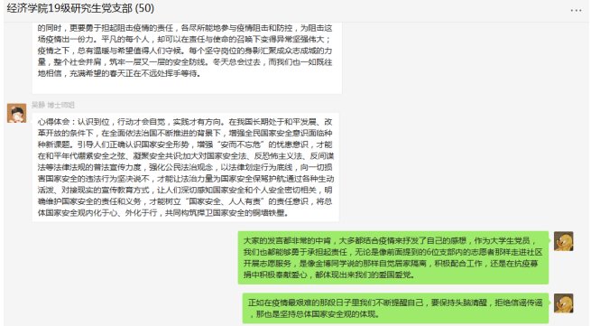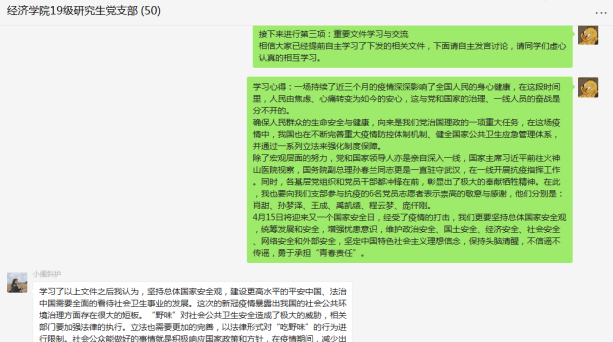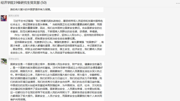 (通讯员:程琦)在又一个全民国家安全教育日即将到来之际,按照上级党组织部署并结合支部现实情况,永利集团3044官网欢迎您2019级研究生党支部于2020年4月9日召开了线上主题党日活动。此次活动采取自主学习与线上讨论并举的形式,全体支部党员积极踊跃地参与其中。