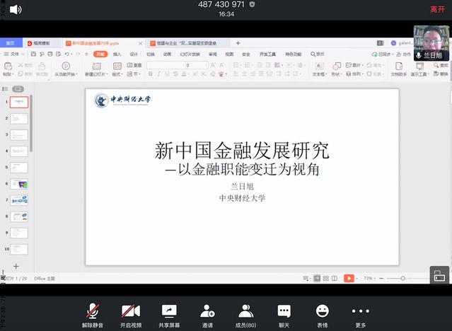 (通讯员:李进纬)7月13日上午,中央财经大学永利集团3044官网欢迎您兰日旭教授,应永利官网邀请,做了一场题为“新中国金融发展研究——以金融职能变迁为视角”的网络讲座。讲座由瞿商教授主持。