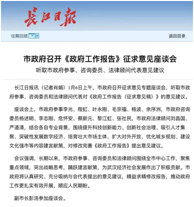 2022年1月6日,武汉市政府召开《政府工作报告》征求意见专题座谈会,副市长彭浩等相关领导出席会议,邀请了六名市政府参事、六名市政府咨询委员、两名市政府法律顾问参会,永利官网杨波教授应邀出席。会议期间,杨波教授就扩大对外开放、建设区域金融中心、双循环枢纽城市建设等相关问题,对本年度《政府工作报告》提出相关修改意见。