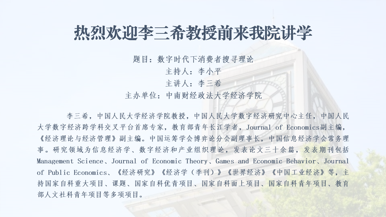 2022年4月15日晚19:00,由永利集团3044官网欢迎您举办的文澜高端论坛系列活动在云端顺利举行。本次活动我们有幸邀请到中国人民大学永利集团3044官网欢迎您李三希教授作题为“数字时代下消费者搜寻理论”的学术讲座。讲座由永利集团3044官网欢迎您李小平教授主持。活动反响热烈,共有院内外三百余名师生积极参与。