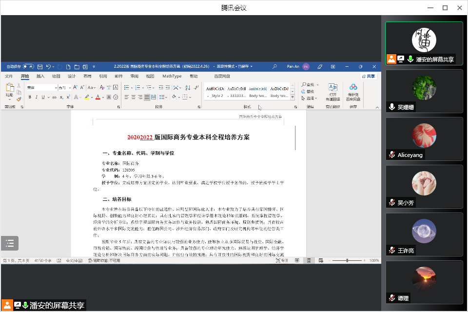 为了更好地完成国际商务专业2022版本科全程培养方案修订工作,国际经济学系于2022年4月27日上午9点30分在线召开培养方案研讨会。会议由国际经济学系主任潘安老师主持,参会人员包括系副主任吴姗姗老师,教研室主任谭理老师、吴小芳老师,资深教授代表佘群芝老师、杨艳红老师,以及青年教师代表余娟娟老师、黄赛男老师、杨柳青青老师、王许亮老师等。