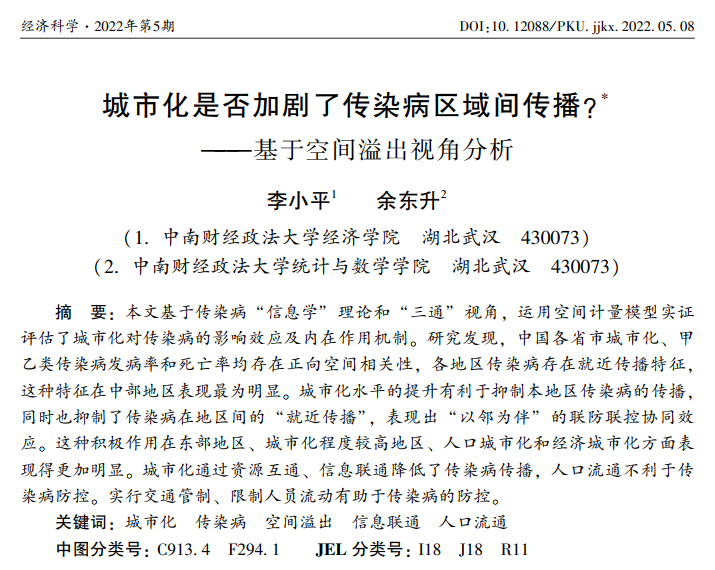 2022年10月,永利官网李小平教授合作论文《城市化是否加剧了传染病区域间传播?——基于空间溢出视角分析》在期刊《经济科学》上正式刊出。