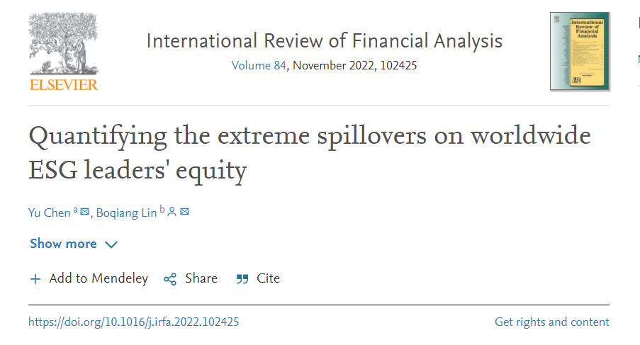 近日,以永利官网教师陈语副教授为第一作者的合作论文《Quantifying the extreme spillovers on worldwide ESG leaders’ equity》在国际知名期刊《International Review of Financial Analysis》2022年第11期上正式刊出。
