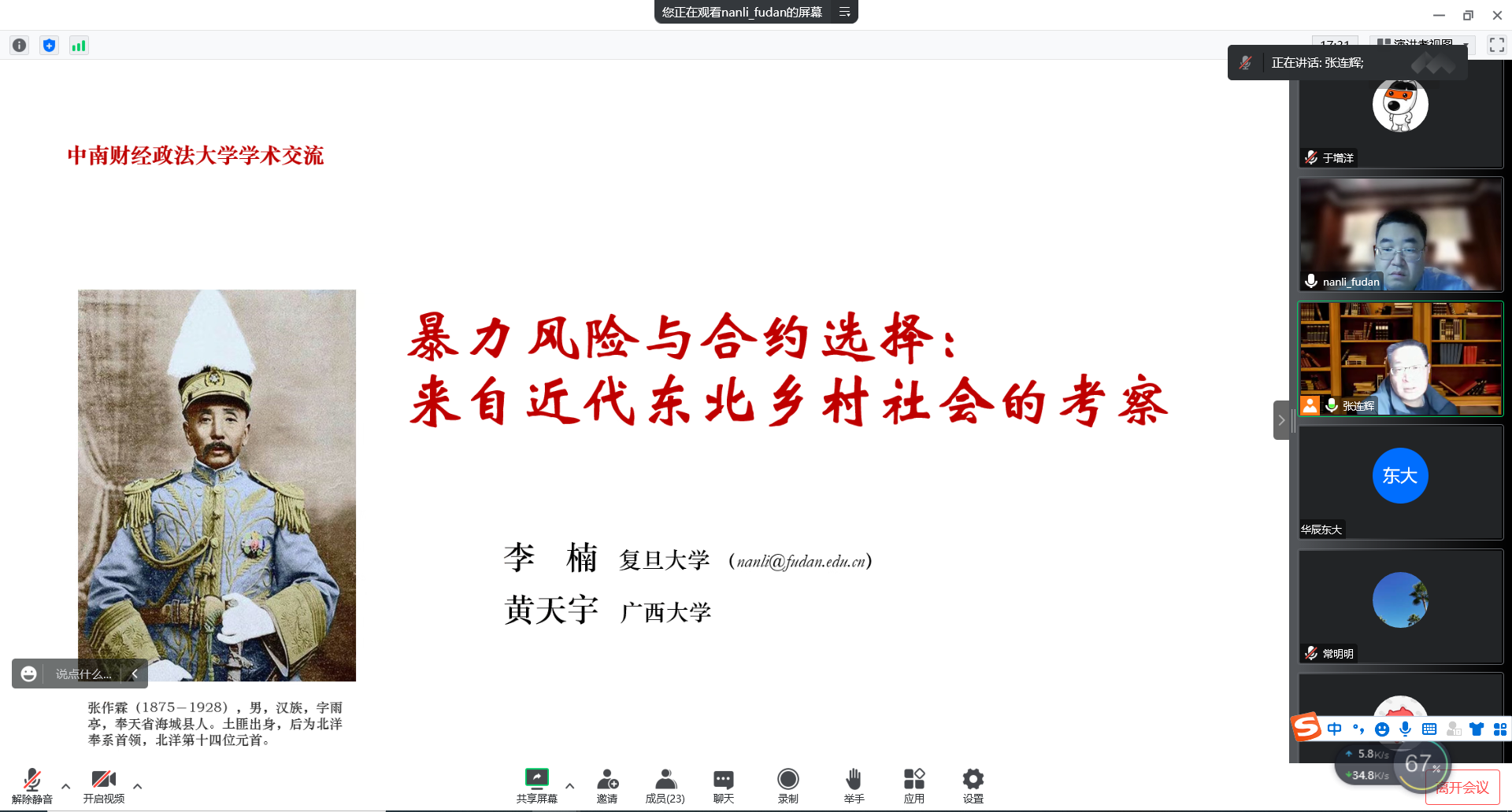 (通讯员:于增洋)11月20日上午,复旦大学永利集团3044官网欢迎您李楠教授应永利官网邀请做了一场题为“暴力风险与合约选择:来自近代东北乡村社会的考察”的线上讲座。讲座由经济史学研究中心张连辉教授主持。