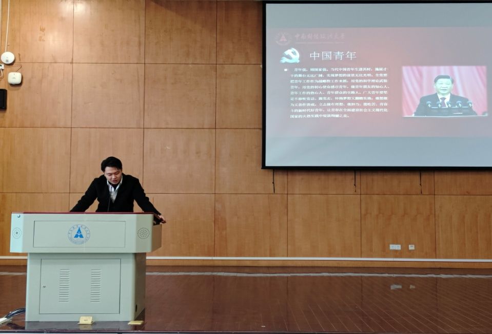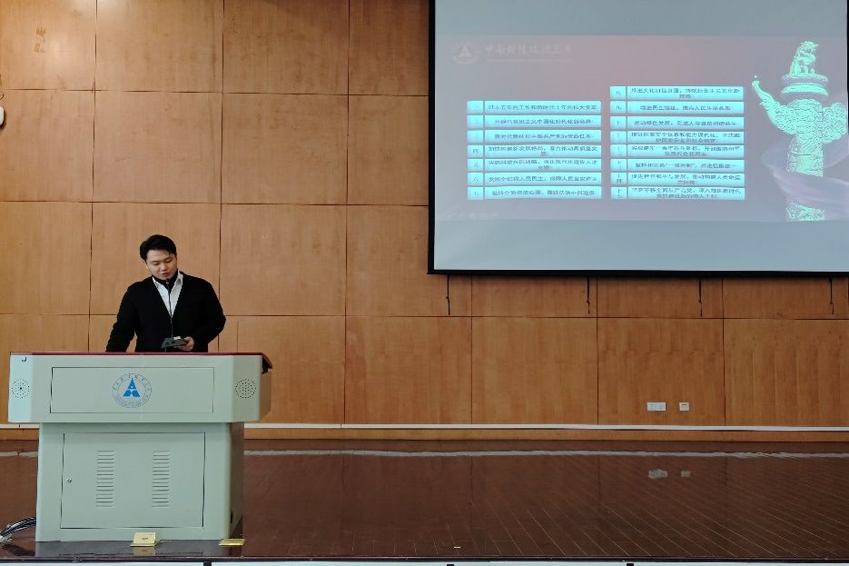 陈远瞻从“高举中国特色社会主义伟大旗帜、全面贯彻新时代中国特色社会主义思想”的大会主题展开介绍,带领同学们共同学习党的二十大报告十五个部分的相关内容,并和同学们分享交流心得体会。