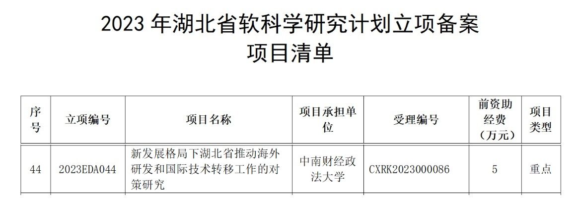 近日,湖北省科技厅公布2023年湖北省软科学研究计划立项备案项目,永利官网杨波教授的项目《新发展格局下湖北省推动海外研发和国际技术转移工作的对策研究》入选重点项目清单。