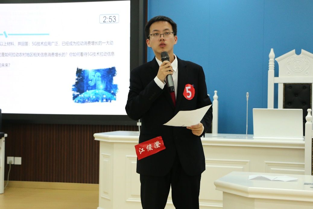 紧接着,更加紧张刺激的第二轮比赛展开。四位晋级选手现场抽取答题顺序,根据所给文字题进行即兴作答,每位选手有3分钟思考时间,完成后由评委老师进行提问、点评、打分。第一位5号江俊澄同学就“5G技术如何拉动消费增长”展开阐述,在进行了充分的思考后,沉着冷静地给出了答案;接下来,4号夏怡萌同学凭借其扎实的经济学知识,对“减税降费下,小微企业为何成为受益主体并且如何进一步提升企业竞争力”这一问题进行了充分的作答;6号王泽宇同学临危不乱,对“数字经济的前景”这一问题展开了具体的论述;最后,2号杞欣蓓同学逻辑清晰地对“中小型企业如何进一步推动数字化转型”这一时事进行了阐述。在层层角逐后,最终,2号杞欣蓓和4号夏怡萌进入最终的赛段。