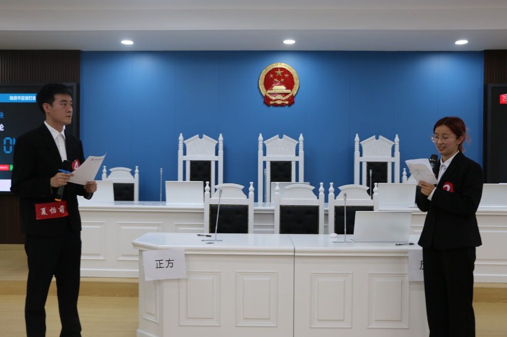 比赛进行到第三轮,同时也是最高潮的一部分。本轮采用自由辩论、你来我往的形式,两名选手抽签决定正反方,在进行3分钟的限时思考后,展开2分钟的观点论述,最后双方进行1分钟的结辩。正反方就“政府是否应该打击黄牛党”来展开论述。正方辩手夏怡萌层次明晰,有理有据;反方辩手杞欣蓓步步紧逼,环环相扣。双方的辩论可谓是精彩绝伦,最终正方辩手夏怡萌以其丰厚的知识储备,以及高超的辩论技巧赢得三位评委的一致投票,强势夺冠。