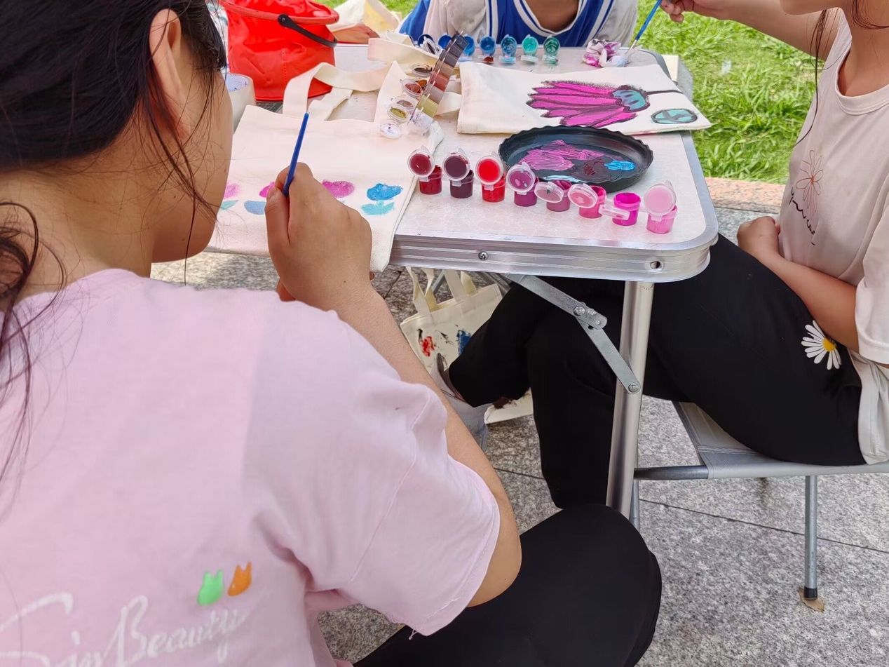 活动当天,小组成员们早早来到活动场地将摊点布置好,并按照活动分工迅速开展了活动工作。本次活动保留了手工布袋diy环节并增添了植物拓染diy环节,希望同学们能通过自己的设计将校园内的落花落叶创造转化成自己满意的艺术品。小组成员们兵分两路,部分成员在校园各处向往来的同学宣传活动并收集落花落叶,其余成员则留守摊位接待来参加活动的同学。丰富有趣的活动内容很快就吸引来了许多参加活动的同学,每个人都在积极地发挥自己的创造力,将一片片落花落叶转化成一幅幅美丽的画作。活动当天正值“5·20”这一特殊日子,这为本次活动的开展增添了别样色彩,绿色与浪漫的碰撞,也为校园增加了别般韵味。