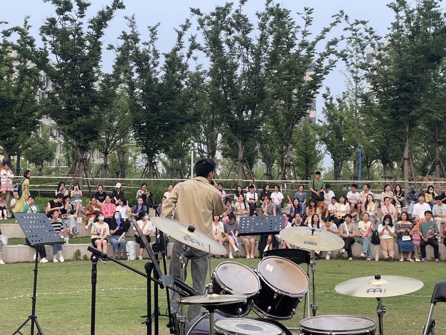 下午6点解忧打卡行活动结束后,各小组成员回到五羊广场摊点处集合,一同整理剩余物资并放回物资室。与此同时,另一组小组成员在三个小时的精心布置与准备后,晚上7点的草坪音乐会准时开始。由于活动前期的积极宣传,环湖绿道上聚集了很多闻讯赶来参加的同学,大家十分热情活跃,领取了荧光棒后纷纷挑选合适的位置坐下欣赏本次音乐会。草坪音乐会进行过程中,同学们参与兴趣浓厚,随着音乐的节拍挥舞手中的荧光棒,时不时跟着歌手一起唱,整场活动氛围格外和谐舒适。音乐会进行过程中穿插着的互动游戏及随舞也很抓人眼球,同学们都积极参与、热情欢呼。晚上9:30,在大家的欢呼声中,本次草坪音乐会画上了圆满的句号。从七点到九点三十,草坪音乐会陪大家共度了两小时三十分的美好时光,陪伴大家度过了一个难忘且浪漫的5月20日。