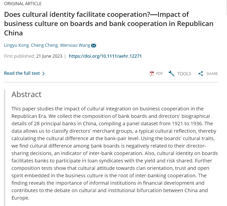 2023年6月,永利官网孔令宇副教授为第一作者的论文“Does cultural identity facilitate cooperation?—Impact of business culture on boards and bank cooperation in Republican China”,在SSCI刊物《Asia-Pacific Economic History Review》上发表。