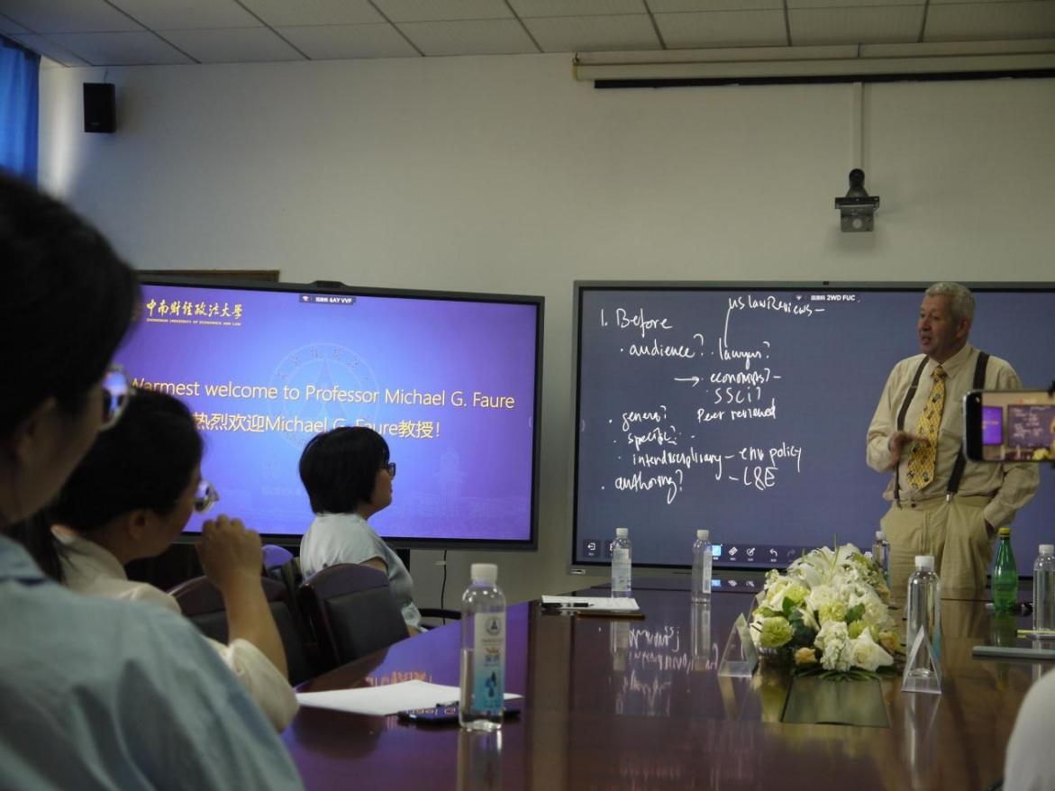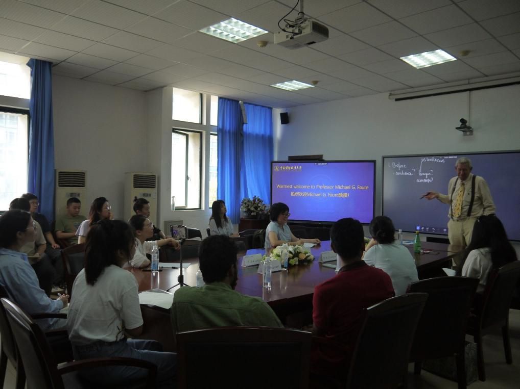 授聘仪式结束后,Faure教授应邀,在8月29日、30日上午以“环境与气候变化法的经济分析”为主题举办了两场讲座。讲座由永利集团3044官网欢迎您全球气候法经济学研究中心主任、永利集团3044官网欢迎您曾盈盈副教授主持。Faure教授就环境法和气候变化法的经济学基础与分析、中欧气候合作以及跨学科研究、英语学术论文的撰写与期刊发表等做了精彩的分享。