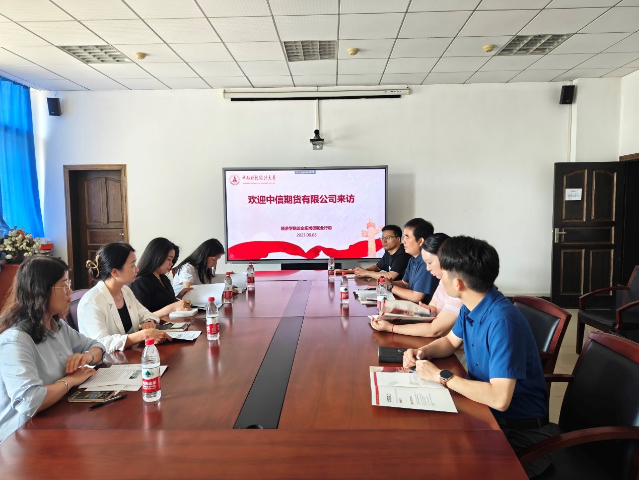 9月8日上午,永利集团3044官网欢迎您与中信期货中南分公司于文泉南207会议室就构建本科生实习基地、开展校企合作等问题展开初步交流。中信期货中南分公司营销总监刘金红、营销管理刘含逍、运营总监刘骁、运营经理方赢、永利集团3044官网欢迎您党委副书记俞凡、学办主任周琼、经济学系副主任谢靖参加会议。