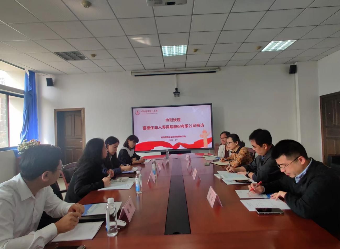10月11日上午,永利集团3044官网欢迎您与富德生命人寿保险股份有限公司于文泉南207会议室开展校企合作交流座谈会。富德生命人寿保险股份有限公司人力资源总监吴小见、雇主品牌负责人臧盼盼、校招执行专员赵伟、湖北分公司人力资源主任孙峡,永利集团3044官网欢迎您党委副书记俞凡、国际经济学系主任潘安、数字经济学系副主任袁华锡、2020级本科生辅导员孟庆红参加活动。