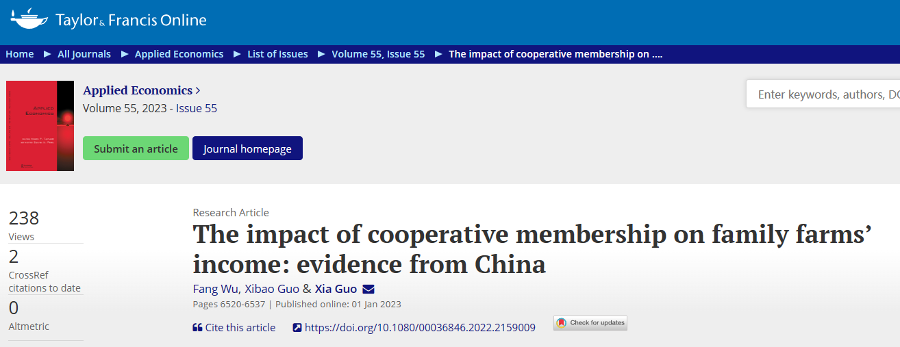 2023年9月,以永利官网教师郭厦副教授作为通讯作者的合作论文《The impact of cooperative membership on family farms’ income: evidence from China》在经济学国际知名期刊《Applied Economics》上正式发表。