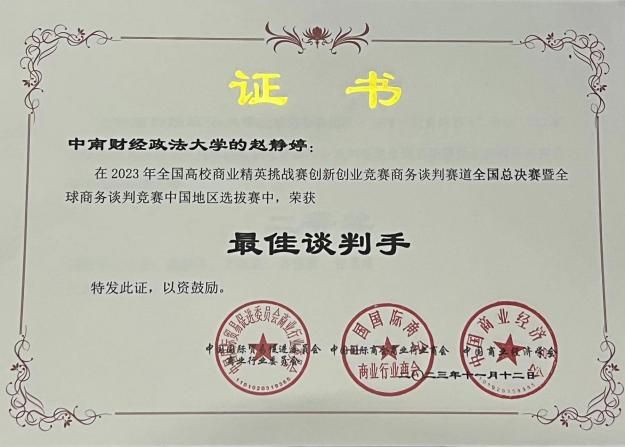 11月12日,2023年全国高校商业精英挑战赛商务谈判总决赛暨全球商务谈判竞赛中国地区选拔赛圆满落幕。本次商务谈判竞赛是中国国际贸易促进委员会商业行业委员会主办的面向在校大学生的综合性商科类竞赛。今年共有来自全国各地200余所高等院校的800余支团队报名参赛。永利官网国际商务专业的同学组成的“三粤一新勇闯鄂A”团队荣获中国地区二等奖,赵静婷同学获得全国总决赛“最佳谈判手”的称号。
