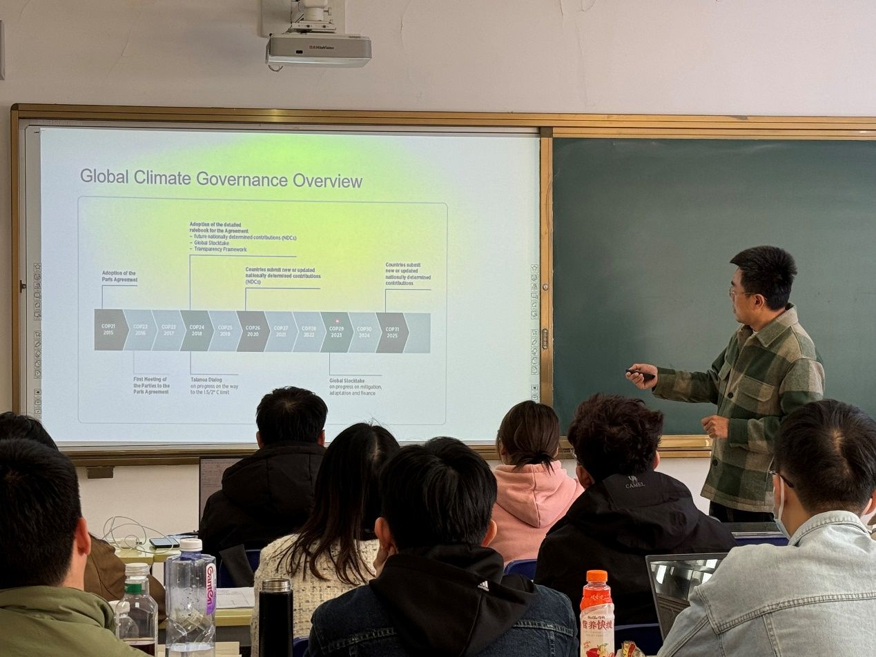 赵嘉靖老师对于温室效应的产生原理进行简要说明,并借此引入控制温室气体排放的必要性。紧接着,赵嘉靖老师在全球层面阐述人类在控制温室气体排放方面所做出的努力,即对全球气候治理进行简要概述,其中重点介绍了《联合国气候变化框架公约》缔约方会议(COP)会议的历届重点成果,如国家自主贡献(NDCs)以及全球盘点等热点议题。