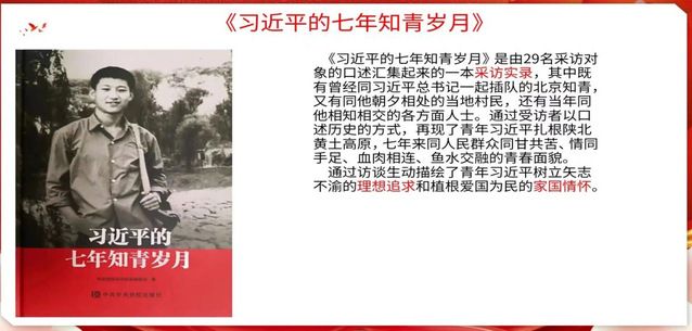 “作为新时代的青年党员,我们很难体会到上个世纪人民的生活困苦,但是《习近平的七年知青岁月》这本书让我深刻感受到人民对美好生活的向往,让我明白将人民对美好未来生活向往转化为现实是我们新时代青年党员义不容辞的责任和使命!”