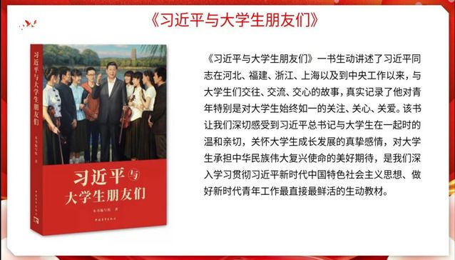 “读完《习近平与大学生朋友们》这本书,我深切地感受到了习近平总书记对大学生的关怀以及对大学生承担中华民族伟大复兴使命的美好期待,这本书是我们深入学习贯彻习近平新时代中国特色社会主义思想、做好新时代青年工作鲜活生动的教材。”