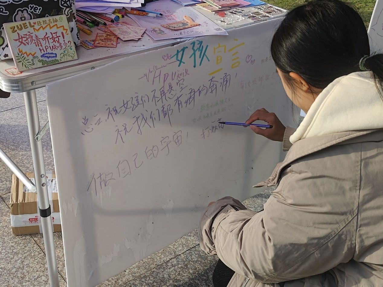 活动当天,志愿者在现场设置展板,每位同学都有机会在上面写下自己的寄语。这是一个表达健康与生命的独特机会,也是一个共同为宫颈癌防治事业献上一份心意的时刻。在这片空间,我们看到了充满力量和爱的文字,我们的心灵在这个共同的主题下连接起来,铸就了一个充满正能量的未来。