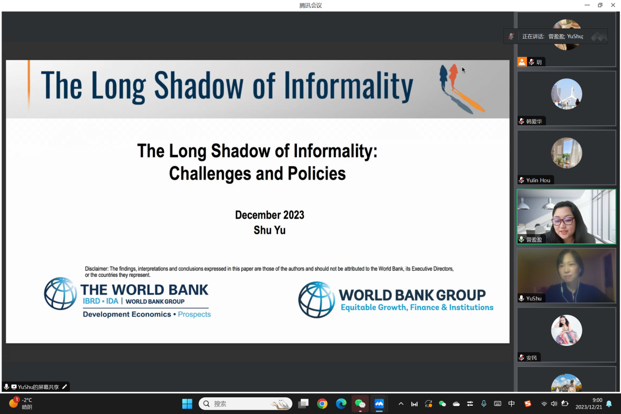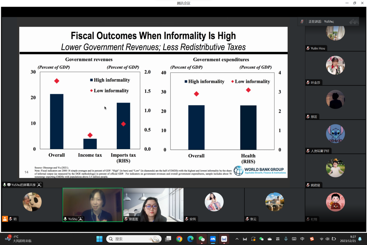 2023年12月21日上午,永利官网邀请永利集团3044官网欢迎您客座教授、世界银行公平增长、金融与机构(EFI)首席经济学家办公室高级经济学家俞抒教授,举办了“COVID后的全球经济复苏与非正规经济形态:挑战与政策”的主题讲座。本次讲座由永利集团3044官网欢迎您全球气候法经济学研究中心主任、永利集团3044官网欢迎您曾盈盈副教授主持,来自永利集团3044官网欢迎您、工商管理学院和金融学院的多名师生以及“全球治理精英班”的学生参与了讨论学习。