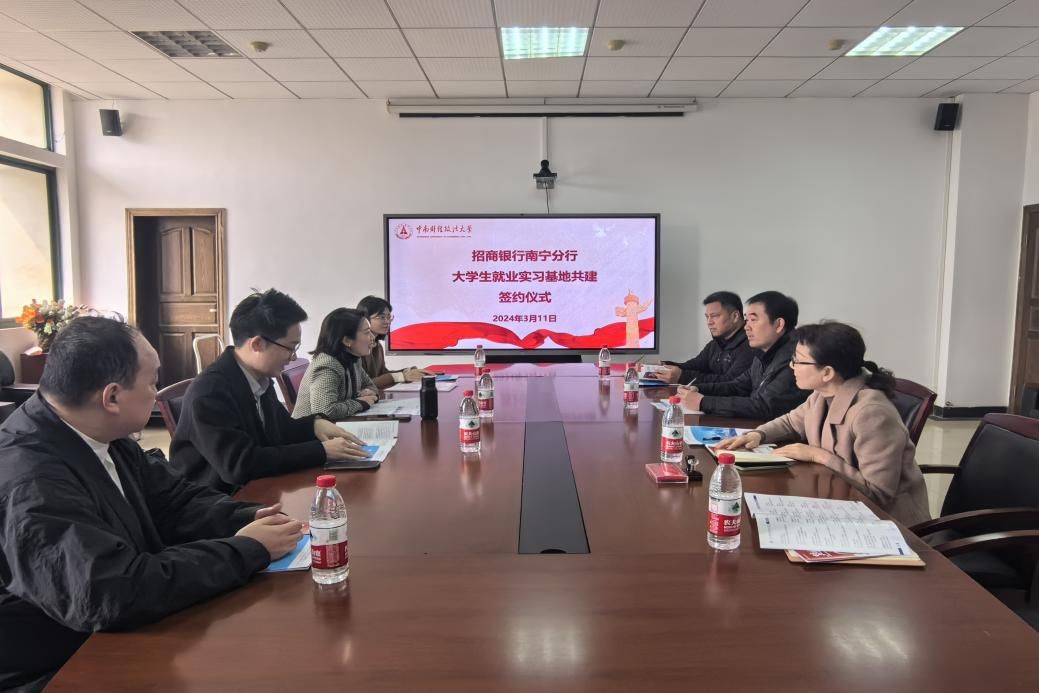 3月11日上午,招商银行南宁分行与永利集团3044官网欢迎您于文泉楼南207会议室举行了大学生就业实习基地共建签约仪式。招商银行南宁分行人力资源部负责人黄婉莹,人力专员覃献莹,永利集团3044官网欢迎您党委副书记俞凡,经济学系副教授陈立兵、2020级本科生辅导员孟庆红、沈鹏飞出席仪式。