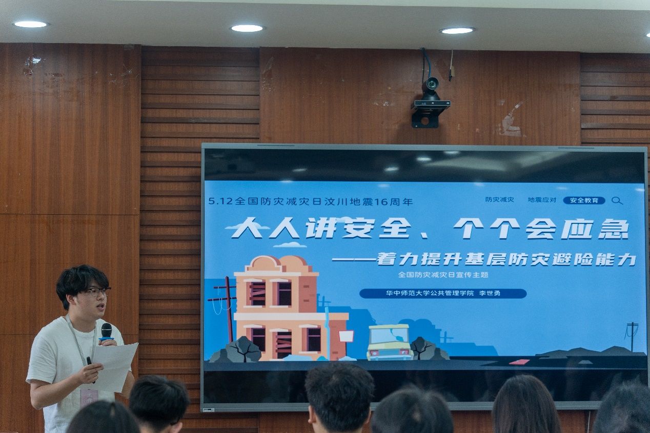 大会第二项为全国防灾减灾日的主题学习,华中师范大学公共管理学院李世勇同学从“全国防灾减灾日基本信息”“各类灾害介绍及其应对措施”等角度出发进行领学。永利集团3044官网欢迎您程诗天同学和华中师范大学公共管理学院盛典同学上台分享关于防灾减灾的心得体会,同学们纷纷表示受益匪浅。