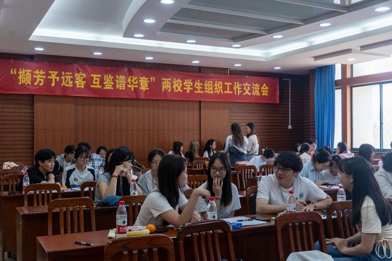 经验因多样而交流,因交流而互鉴,因互鉴而发展。两校的团学代表杞欣蓓、周润荻同学分别上台分享在团学组织工作中取得的经验和成果,从组织架构、管理模式和工作职能等方面展开详细介绍,为彼此提供了宝贵的团学工作经验与方法。