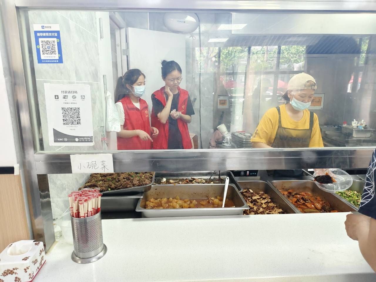 第二路帮厨小组们也是整装待发。他们走入幸福食堂内部,开始帮后厨们做一些力所能及的事情,如洗菜、择菜、打菜等。水流交错,留下了新鲜的食材,飘来了志愿者爽朗的笑声;一勺一盘之间,志愿者与老人们的距离越来越近。
