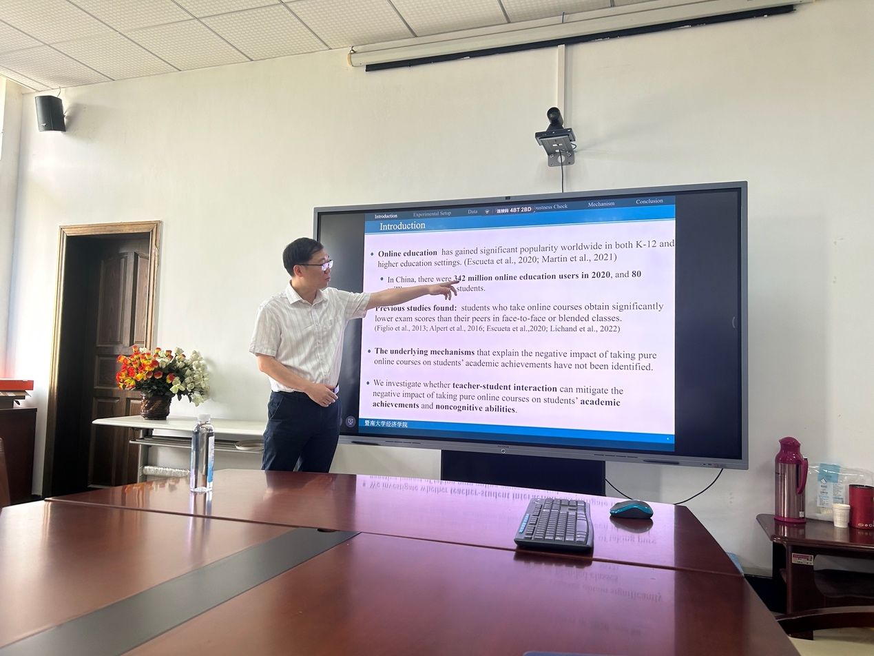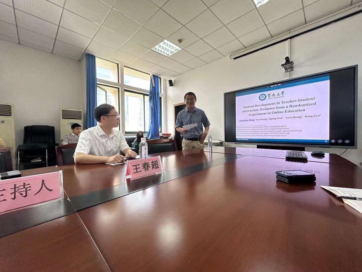 2024年6月6日上午9:00,经济中南“文澜高端论坛系列活动”第58期讲座在文泉楼南207会议室成功举办。本期特邀暨南大学永利集团3044官网欢迎您院长王春超教授作为主讲嘉宾,永利集团3044官网欢迎您院长石智雷教授担任主持人,讲座主题为“Student Development in Teacher-Student Interaction: Evidence from a Randomized Experiment in Online Education”。永利官网周强副教授、潘峣副教授、叶琴博士、袁璐璐博士等30余名师生参加了本次讲座。