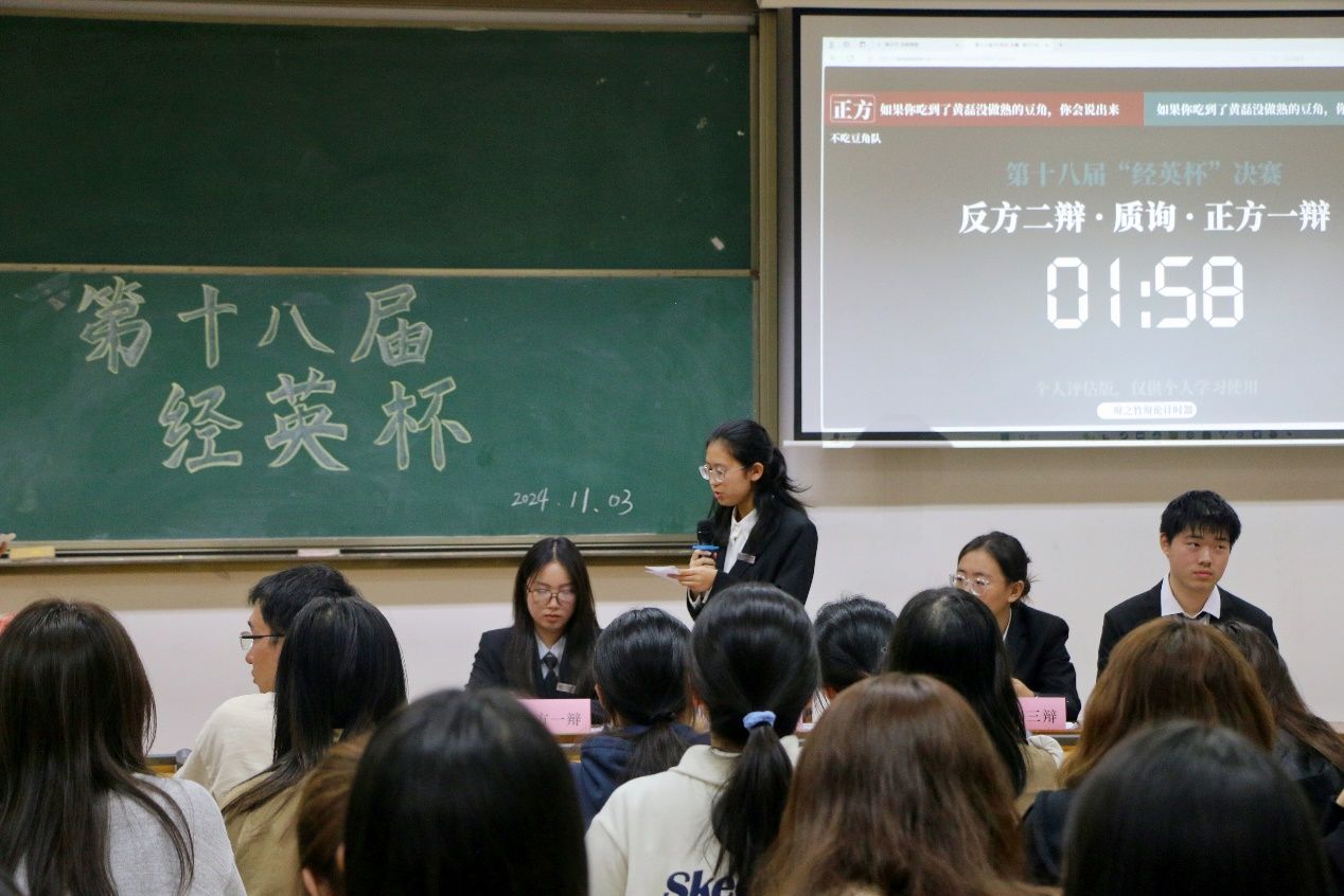 (学生记者 刘路洋 摄影 高舒翔)承儒辩之风,展浩然正气。为丰富校园文化生活,提高大学生思辨能力,永利集团3044官网欢迎您第十八届“经英杯”辩论赛决赛于11月3日19时在首义校区文润楼306教室举行。本次辩论赛由永利集团3044官网欢迎您2023级学生陆美如主持,永利集团3044官网欢迎您2024级全体本科生到场观看。