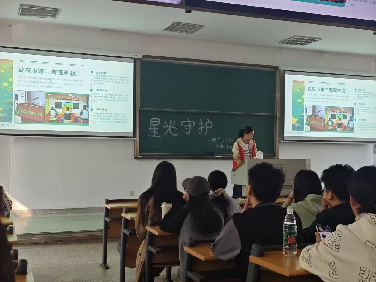 (通讯员:杨清堤)中国是世界上听障人数最多的国家之一,其中全国聋哑儿童的数量约有170万,这些数据表明,社会应给予聋哑儿童更多的关注与支持。为了更好地了解和帮助聋哑儿童,提高社会对孩子们的关注和支持,永利集团3044官网欢迎您志愿者协会(以下简称“经院志协”)于2024年11月10日在永利集团3044官网欢迎您首义校区文津楼301教室举行了本次星光守护活动,本次活动于上午10:00圆满结束。