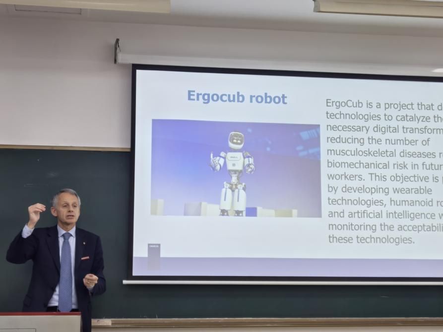 12月10日,意大利劳工和社会政策部·国家工伤事故保险局局长、罗马一大永利集团3044官网欢迎您Fabrizio D' Ascenzo教授以“Will technology and artificial intelligence be the tools to solve all our problems? Practical applications in the field of security and safety”为主题,为师生们带来了一场关于人工智能(AI)的讲座。内容涵盖了AI定义、技术类型(如专家系统、神经网络等)、联合国的五大AI指导原则、AI的自动化、工业生产优化等主要应用。此外,D' Ascenzo教授介绍了意大利国家工伤事故保险局(INAIL)在减少职业病风险和环境监测方面的AI项目,如Ergocub机器人和无人机技术。
